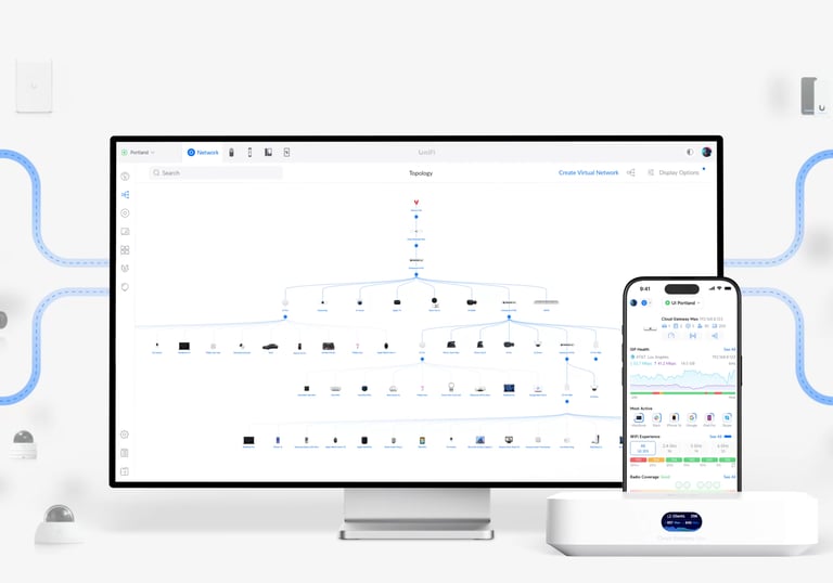 Ubiquiti UniFi is een professioneel netwerkplatform waarbij Modem/Router, WiFi punten, camera’s, netwerkopslag en deurcontrole centraal worden beheerd vanuit één dashboard.